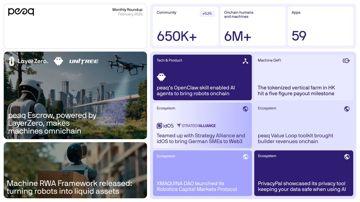 In addition, peaq announced a partnership with Strategy Alliance and idOS to support German SMEs in entering the Machine Economy, focusing on machine IDs, machine wallets, and compliant tokenization for real-world industrial deployment. Further advancing its RWA narrative, peaq launched the Machine Tokenization (RWA) Framework — the first full-stack framework to tokenize and finance robots — with limited spots available for the official pilot. The Purple Paper, peaq's long-term masterplan, remained on the community's radar heading into March.